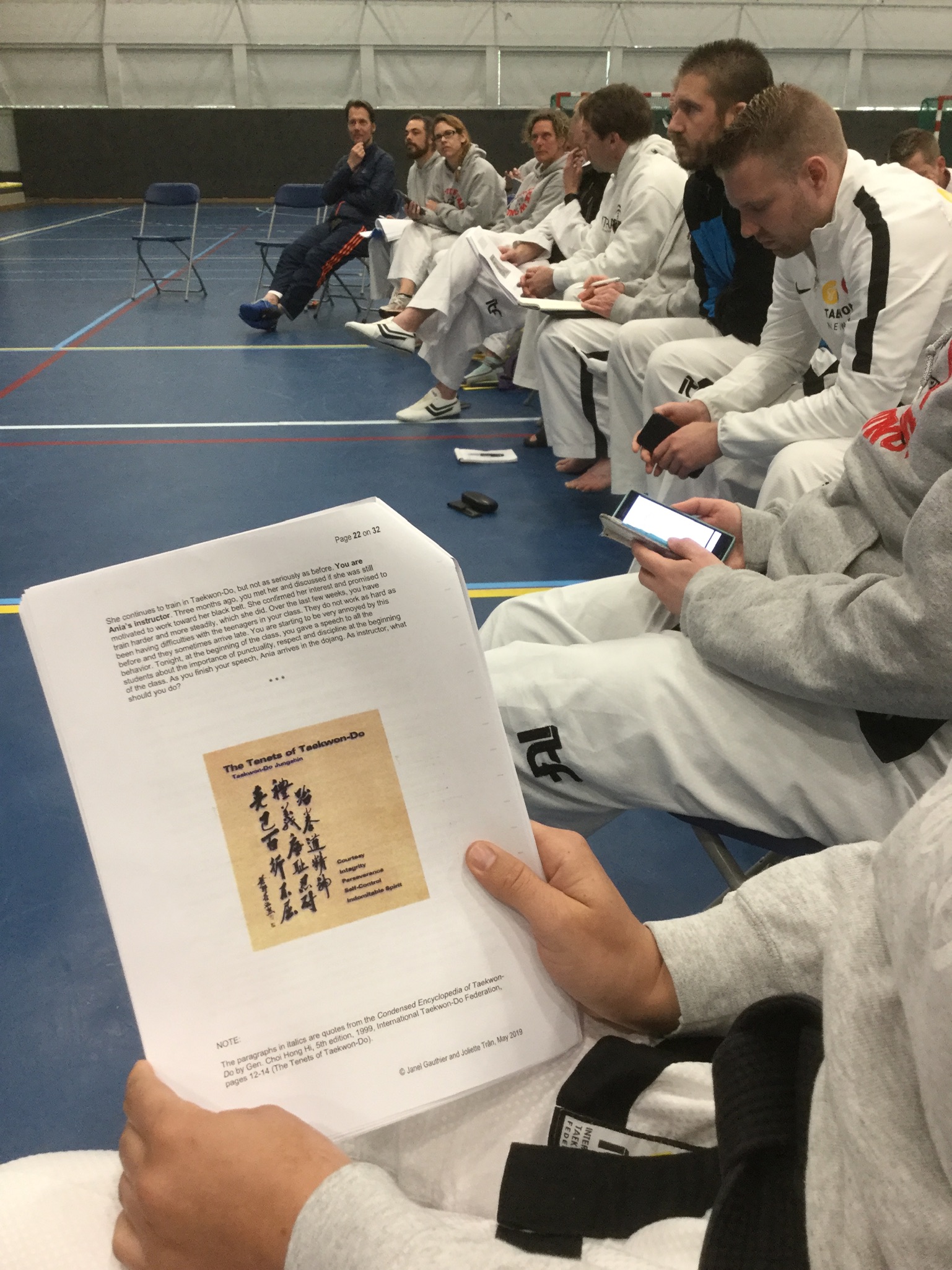 Aan de hand van zowel fysieke als theoretische oefeningen werden de deelnemers bewust gemaakt van hoe je de “Do” kunt verweven in alles wat je doet in de dojang – of je nou lesgeeft of zelf traint – en daarbuiten. Er werden ook morele dilemma’s gepresenteerd waarin de morele waarden mogelijk in conflict lagen met elkaar, wat mooie hersengymnastiek opleverde.